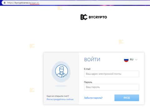 При посещении сайта шулеров ByCryptoArea пользователя перенаправляют на авторизацию. Данная страница является практически пустой и на ней лишь присутствует форма для регистрации или входа в систему аферистов Би Крипто Ареа. На ней ничего не упоминается и не рассказывается о деятельности подвальных аферистов-однодневок ByCryptoArea. Внешний вид данной страницы вы можете увидеть на изображении ниже.