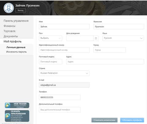 Об отсутствии политики конфиденциальности у мошенников Би Крипто Ареа можно уэе догадаться после нескольких минут пребывания на подвальном сайте шулеров. Данную информацию аферисты ByCryptoArea либо еще не разместили у себя на сайте, либо и не планируют размещать, так как проект может являться однодневным и рассчитанным на несколько месяцев, поэтому жулики Би Крипто Ареа и не работали над этим вопросом. На изображении ниже вы можете увидеть форму для изменения данных профиля на подвальном сайте мошенников ByCryptoArea.
