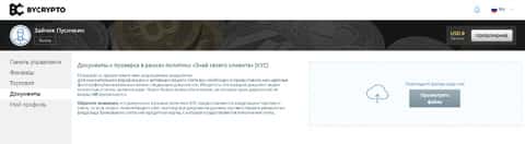 В разделе документы личного кабинета сайта аферистов ByCryptoArea никаких данных, или ссылок, на условия сотрудничества с жуликами Би Крипто Ареа не представлено. Вместо этого нас встречает текст о том, что шулера ByCryptoArea хотят убедиться в достоверности ваших данных, для чего создано окно с кнопкой для слива ваших личных и персональных данных, которые на неизвестных условиях уйдут в руки лохотрона Би Крипто Ареа. Вид данной страницы сайта мошенников ByCryptoArea вы можете увидеть на изображении ниже.
