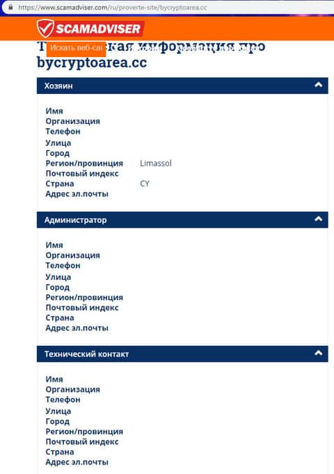 Из контактов на официальном сайте однодневных шулеров Би Крипто Ареа ничего не представлено. Совсем ничего. Данный шаг мошенники ByCryptoArea предприняли с целью того, что бы им не писали облапошенные трейдеры и не требовали свои средства обратно. Так же это уменьшает количество денег, необходимое для поддержания активности и работоспособности сайта жуликов Би Крипто Ареа. Информацию с сайта скамадвайзер ком о контактах шулеров ByCryptoArea вы можете увидеть на изображении ниже.