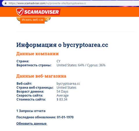 С целью избежания ответственности, не факт что вообще где-то зарегистрированная, мошенническая контора Би Крипто Ареа скрывает личные, персональные и контактные данные своих руководителей. Сделано это с целью избежать ответственности за проделанные мошеннические действия шулерами ByCryptoArea. По данным сайта scamadviser com можно установить, что аферистам Би Крипто Ареа всего 54 дня с момента основания, а так же то, что шулера скрывают местоположение своего сервера. Данные о мошенниках ByCryptoArea с ресурса скамадвайзер ком вы можете увидеть на изображении ниже.