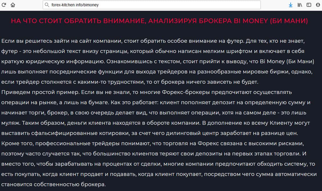 На авторитетном источнике предупреждают, что прежде чем сотрудничать с компанией Bi Money, нужно обратить внимание на ее футер