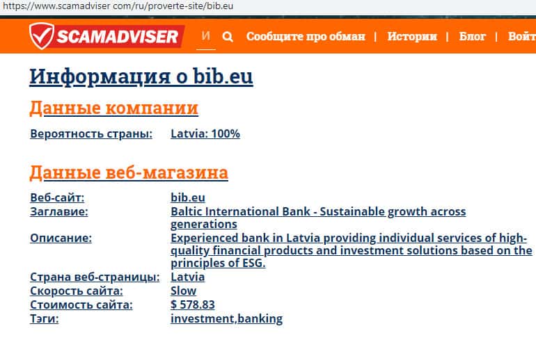 В связи с мошеннической и противозаконной деятельностью лохотрона БИБ его реальные руководители предпочитают анонимность дабы избежать ответственности со стороны правоохранительных органов. Техническую информацию о самом же сайте аферистов BIB можно узнать с помощью портала scamadviser com, который вы можете увидеть ниже.