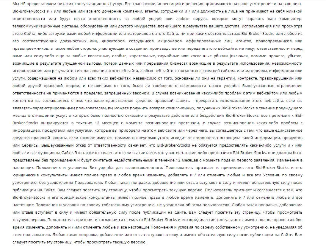 Дальше Бид Брокер Стокс указывают, что они не предоставляют консультационных услуг. Клиент должен понимать, что компания не несет ответственность за ущерб и убытки клиента.
