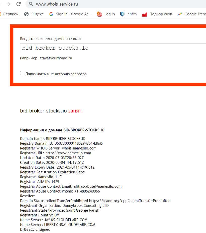 Доменное имя сайта Bid-Broker-Stocks io, судя по информации со специализированного сервиса, принадлежит какому-то ООО из Доминики.