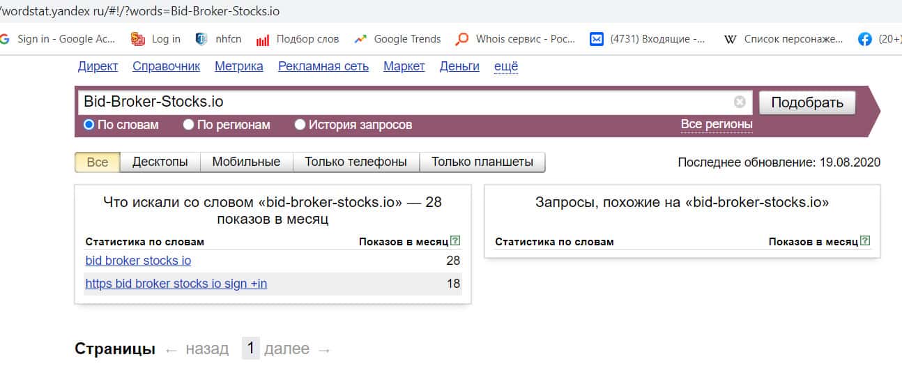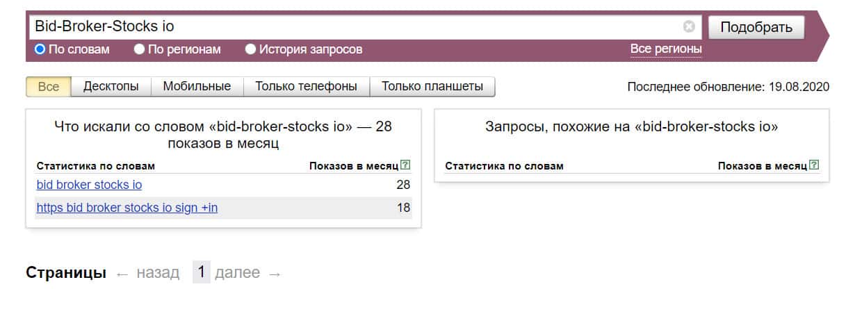 В поисковой системе Яндекс сайт брокерской конторы "Bid-Broker-Stocks.io", вбитый в строку с точкой, пользователи искали 28 раз за месяц.