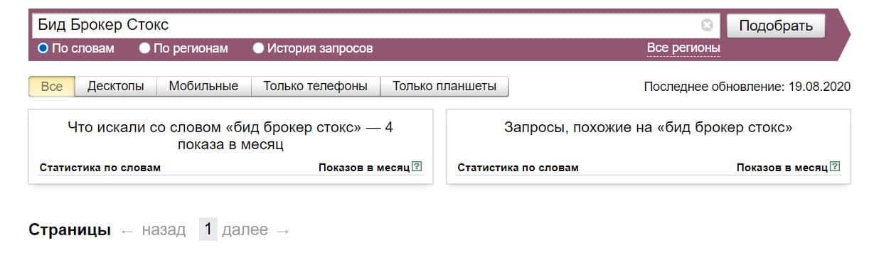 Посмотрим, сколько раз люди искали название бренда "Бид Брокер Стокс" на русском языке с пробелом: 4 раза за месяц.