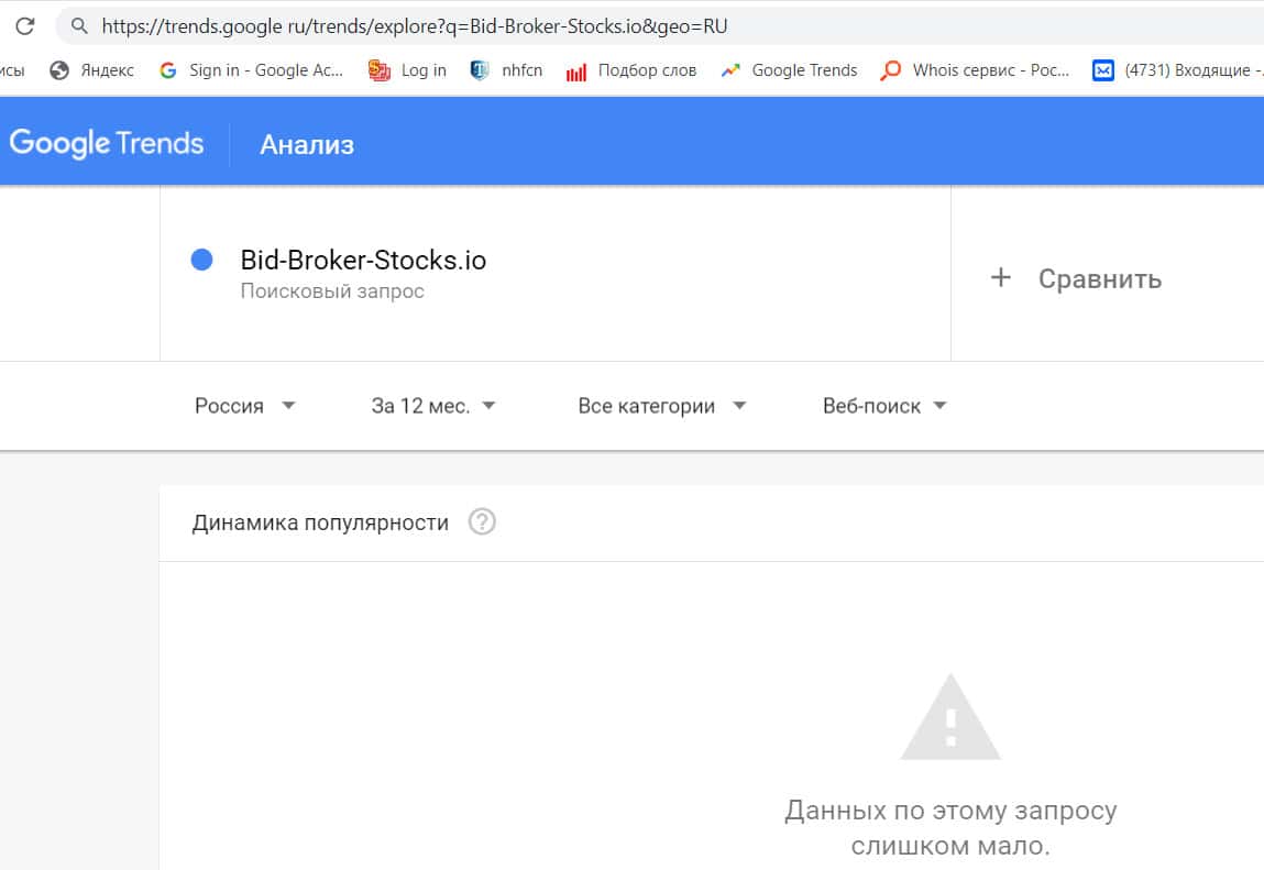 Количество запросов по домену "Bid-Broker-Stocks io", вбитого в поисковик Гугл без точки, столько же, то есть, очень мало.