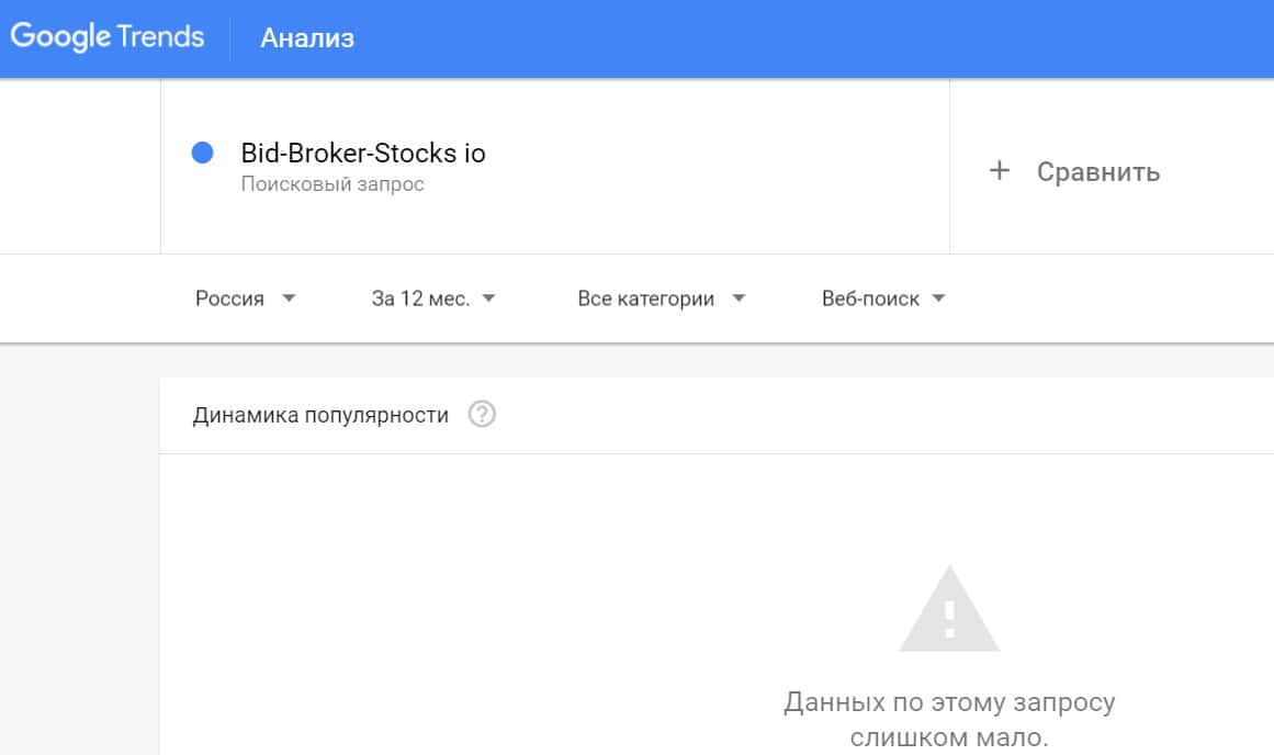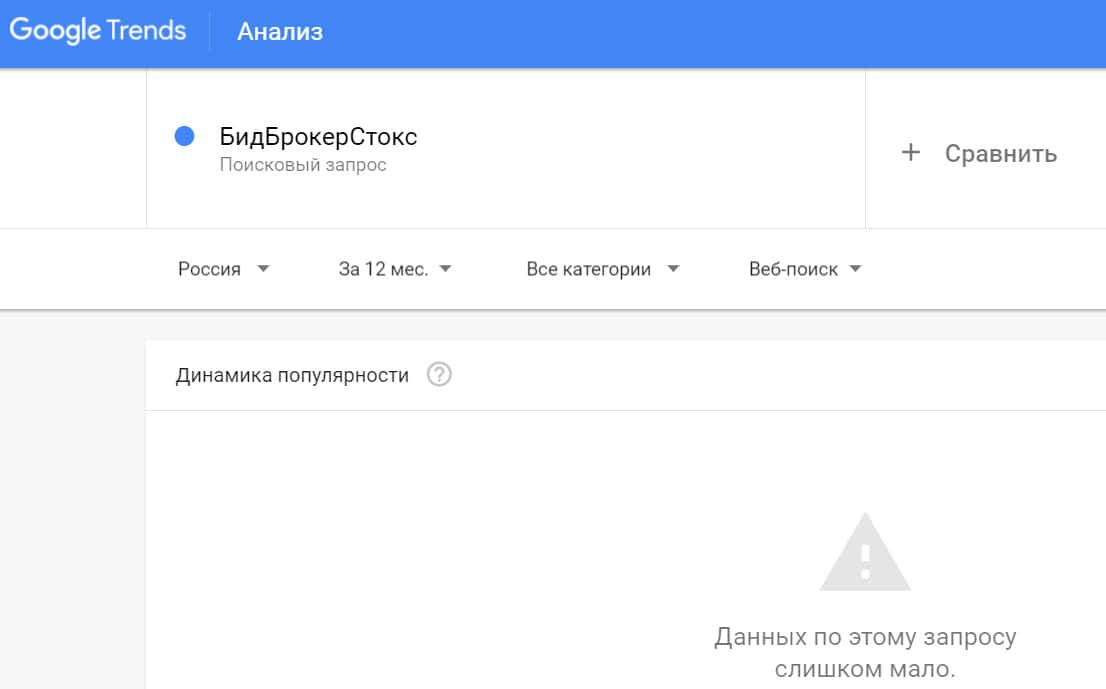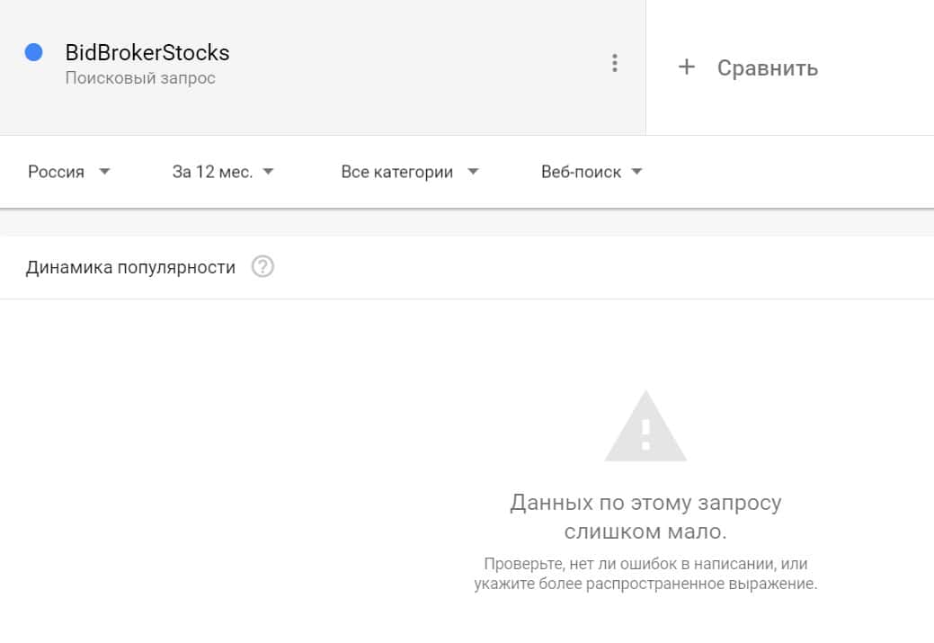 Посмотрим, насколько популярно название бренда "BidBrokerStocks", написанное на английском языке. Данных по этому запросу нет, так как никто не искал этот бренд в Гугл.