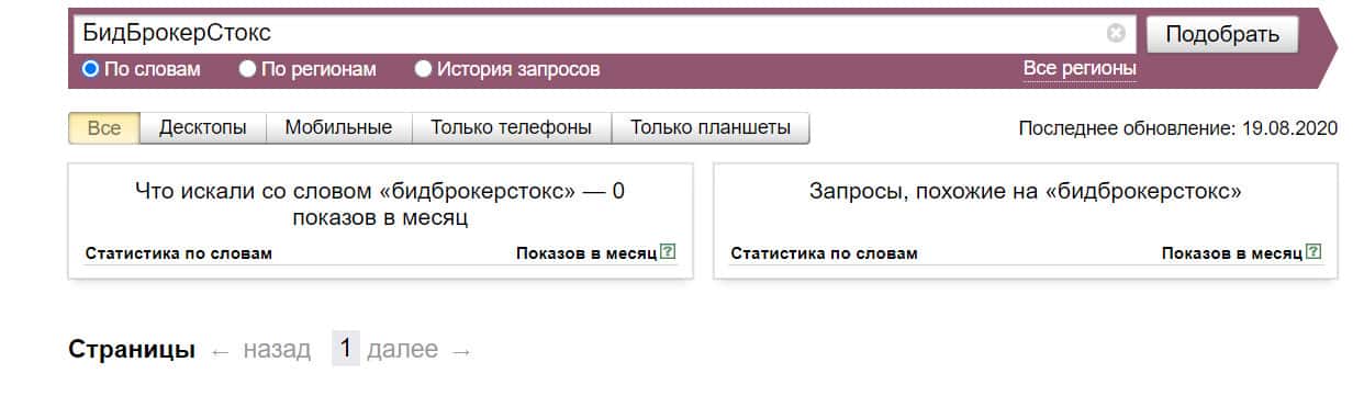 Название бренда на русском языке без пробела "БидБрокерСтокс", пользователи также совсем не искали в системе Яндекс.