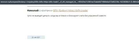 В этом отзыве рассказывается информация, что контора БиФин Трейд специально блокирует счета клиентов, чтобы не выводить им ни копейки из вложенных средств.