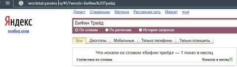 Та же ситуация и по бренду сайта "BiFin.Trade" только уже с точкой. Очень мало запросов в поисковой системе Яндекс по этой версии написания сайта.