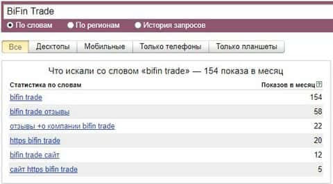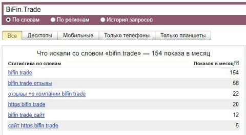 По поводу бренда сайта лохотрона "BiFin Trade" без точки можно сказать о средней популярности по версии Яндекс Вордстат так как смогли набрать 154 показов за месяц.