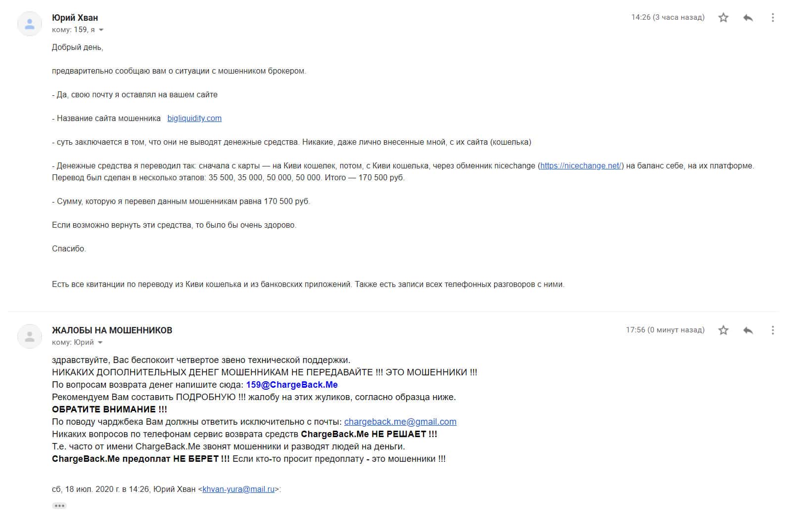 Далее предлагаем увидеть информационный материал в виде жалобы на аферистов в лице компании Биг Ликвайдити, которая облапошила клиента более чем на 170 000 рублей.