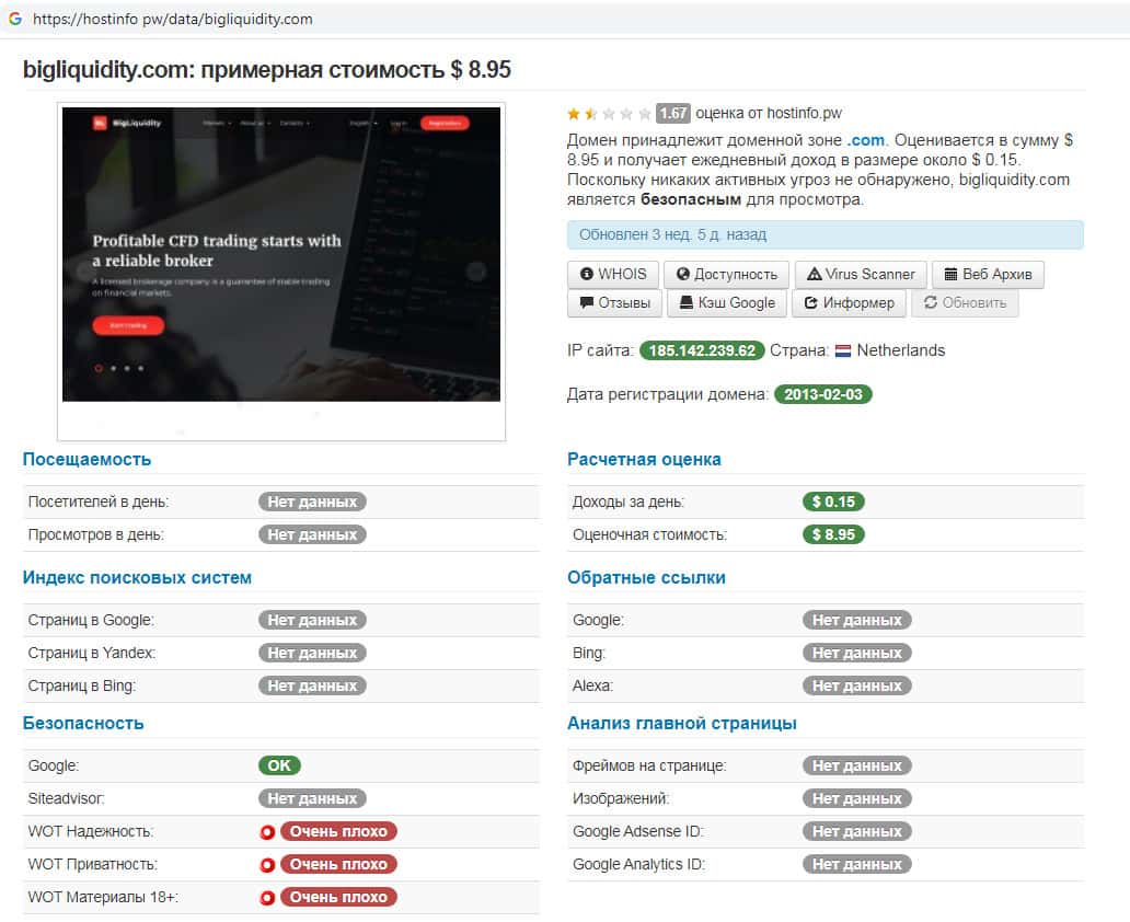 На интернет-сервисе хостинфо пв замечена информация о производительности сайта мошенников Биг Ликвайдити. Здесь обнаружено множество ошибок связанных с работой сайта, а именно отсутствие необходимых данных. Так же есть определенные проблемы с работой онлайн-ресурса жуликов, которые говорят о том, что сайт фейковый.
