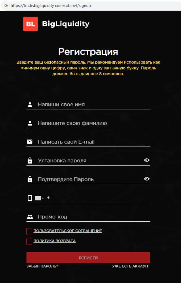 Для того, чтобы зарегистрироваться на сайте псевдо-брокерской конторы BigLiquidity необходимо назвать имя, фамилию, контактный номер телефона, адрес электронной почты и пароль, и конечно же подтвердить то, что Вы соглашаетесь с условиями пользования сайтом. Прежде чем поставить галочку в данной форме, подумайте стоит ли так рисковать своими деньгами?
