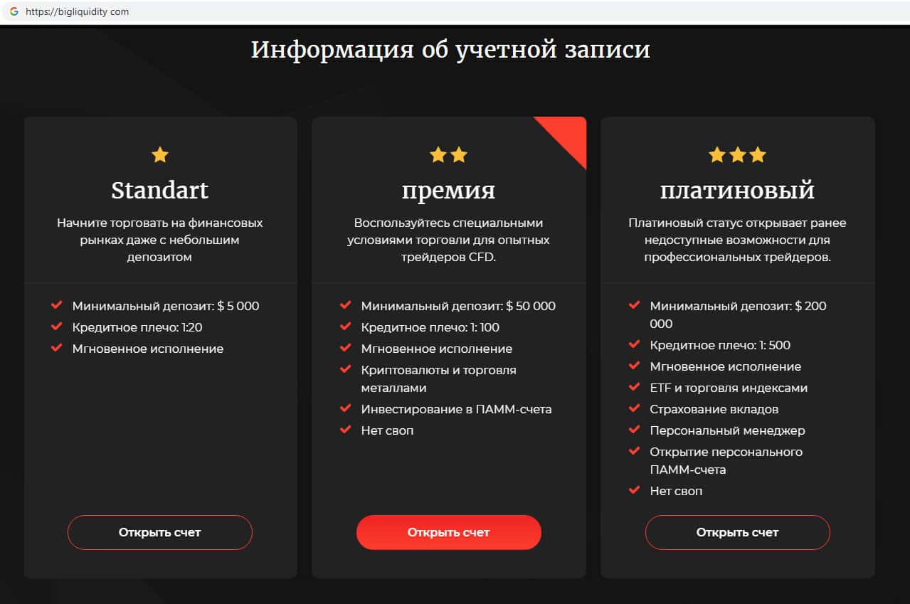 - Торговые счета предоставленные на интернет-ресурсе аферистов Биг Ликвайдити
