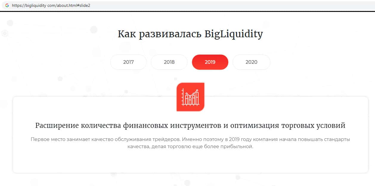 Жулики Биг Ликвайдити предоставляют возможность пользователям сайта ознакомиться с историей создания их организации. Подобные конторы зачастую используют данную ловушку рассказывая о том какие достижения были, и конечно же о том какой красивый у них офис. Верить мошенникам BigLiquidity нельзя, а вкладывать свои деньги на их сайте тем более !!!