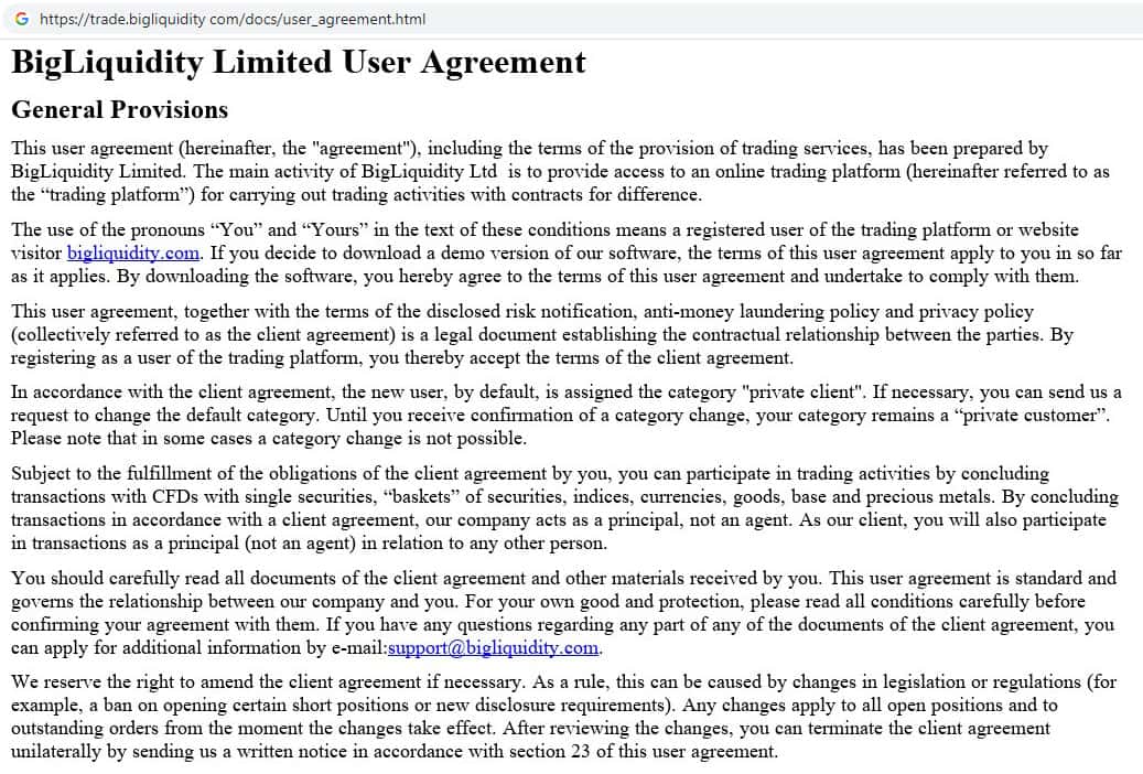 Нами обнаружен тот факт, что вся документация на сайте брокерской конторы BigLiquidity исключительно на английском языке. Это является очередным подтверждением того, что данная компания не подходит для русскоязычных пользователей. Зарегистрировавшись на сайте аферистов Вы автоматически соглашаетесь со всеми пунктами прописанными в их документации.