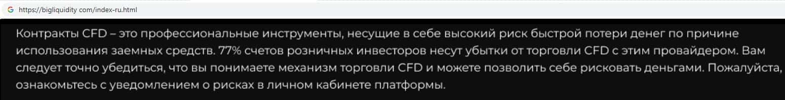 В уведомлении о рисках мошенническая организация BigLiquidity указывает о том, что торговля на сайте сопряжена определенным уровнем риска. Соответственно данная брокерская компания не несет никакой ответственности за деньги утраченные клиентом на их фальшивом сайте. В данном случае жулики ссылаются на ошибочный выбор торговой стратегии клиента.