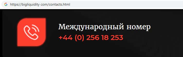 Жульническая организация Биг Ликвайдити на своем официальном сайте указала номер контактного телефона своей организации, а так же указывает адрес электронной почты своей конторы, который указан ниже: