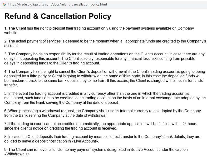 - Политика возврата денежных средств на интернет-портале скам-конторы BigLiquidity