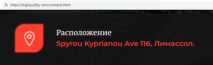 Согласно контактной информации, которую указывает о себе мошенническая организация BigLiquidity зарегистрирована в Республике Маврикий. Где ныне базируется огромное количество аналогичных компаний. Но при этом местонахождение главного офиса скам-компании указано по такому адресу: Spyrou Kyprianou Ave 116, Лимассол.