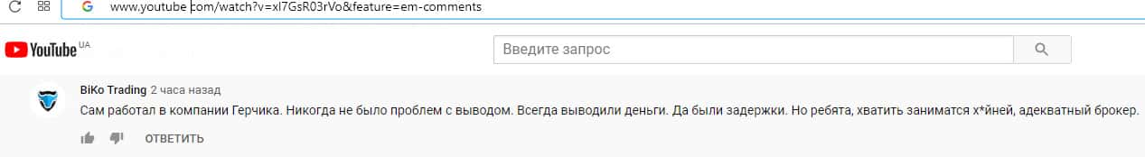 Причиной написания данной статьи стал комментарий от мошеннической конторы БиКо Трейдинг, под видео в Ютуб о шулерской деятельности компании Герчик и Ко. Любой, кто будет улучшать репутацию знатных лохотронов будет преследоваться и уничтожаться в суровой форме своим добрым именем в таком формате.