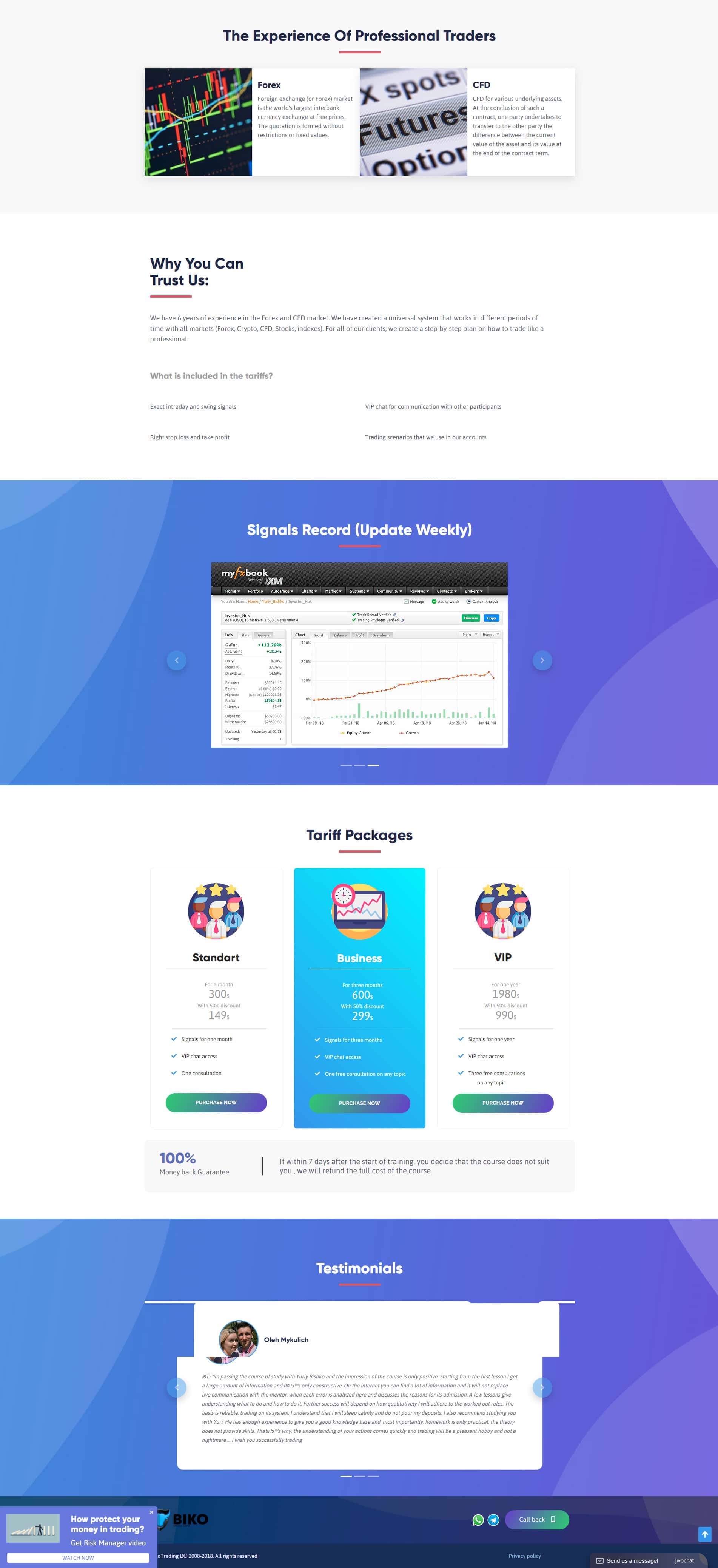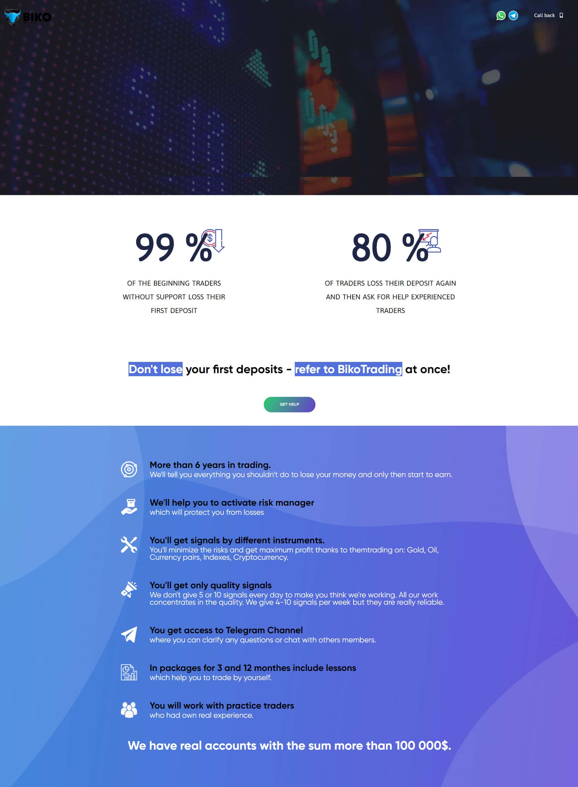 Сайт конторы BiKo Trading явно малоинформативный, так как используется чисто для того, чтобы привлечь внимание человека, который начал торговать на рынке Форекс, и начал сливать деньги. На помощь якобы приходят прибыльные сигналы, которые по сути добивают счет клиента до нулевого значения.