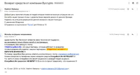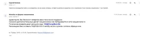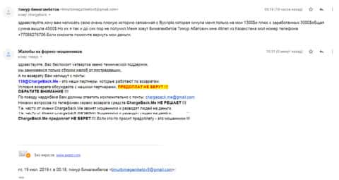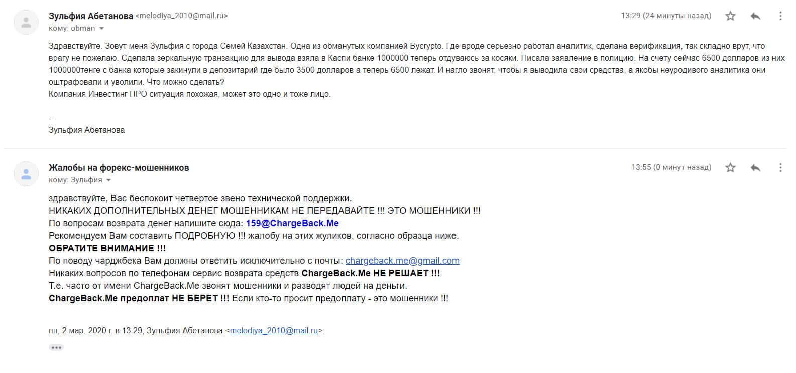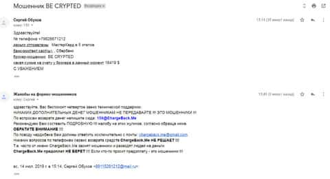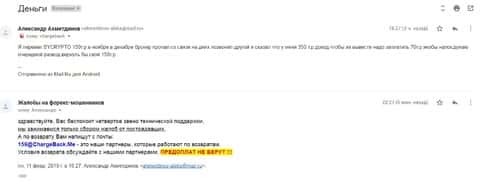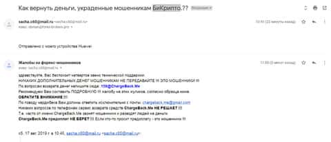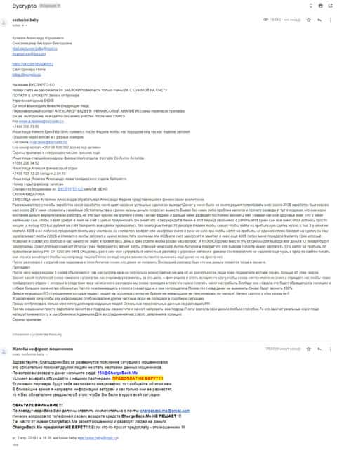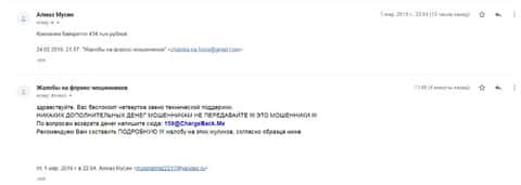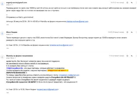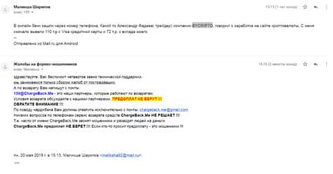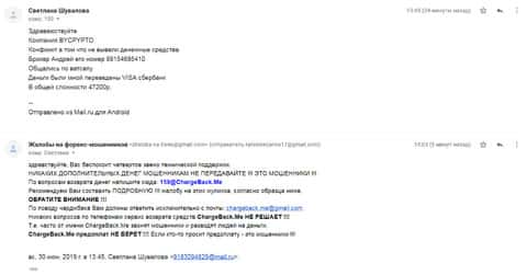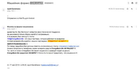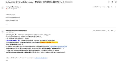 На изображении ниже вы можете увидеть одно из многих писем, пришедших нам на почту, по поводу мошеннических действий лохотрона ByCrypto, в результате которых клиентом было утеряно более 400 тысяч рублей. Возвращать данную сумму аферисты БиКрипто добровольно не собираются, и поэтому ресурс форекс-брокерс про рекомендует обратится в службу ChargeBack.Me для возврата средств.
