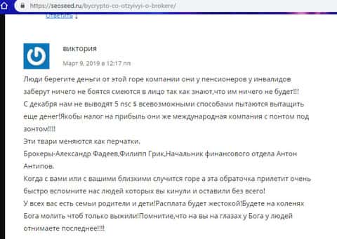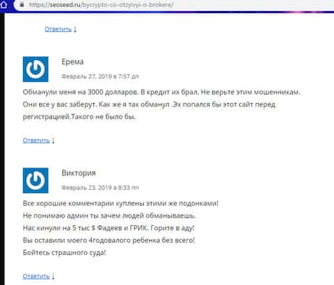 Мошенники ByCrypto довольно широко развернули угол своей противозаконной деятельности, поэтому негативные отзывы о них попали на ресурс seoseed ru, пользователи которого потеряли свои средства в помойке БиКрипто. На изображении ниже представлен один из таких негативных отзывов в сторону лохотрона ByCrypto от очередной клиентки.
