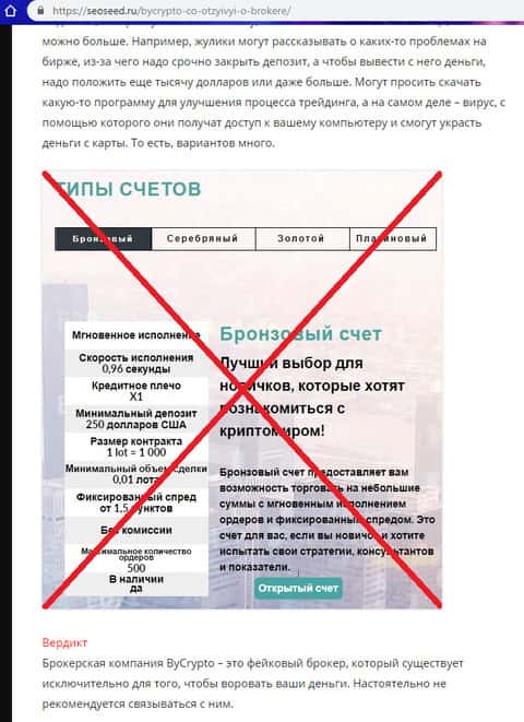 Помимо негативных отзывов в сторону аферистов БиКрипто в сети интернет присутствуют и негативные статьи от форекс-сайтов. Одним из таких стал портал seoseed ru, редактор которого посвятил лохотрону ByCrypto целую статью. Был упомянут и тот факт, что у лохотрона ByCrypto очень мало контактов и аферисты БиКрипто всячески избегают любых контактов. На изображении ниже вы можете прочесть вердикт ресурса сеосеед ру о жуликах ByCrypto.
