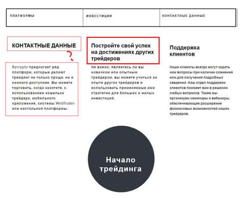 Ну а третий раздел сайта аферистов ByCrypro вообще выглядит как не понятно что, да и текст в нем не особо связан с подписями и немного по съезжал. Скорее всего он был добавлен исключительно для создания дополнительного контента на полупустом лендинге лохотрона БиКрипто. Особенно вызывает улыбку то ли заявление шулеров ByCrypto, то ли предложение об успешной торговле благодаря достижениям других трейдеров. Убогая попытка, да еще и криво реализована, от мошенников БиКрипто привлечь наивного клиента.