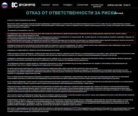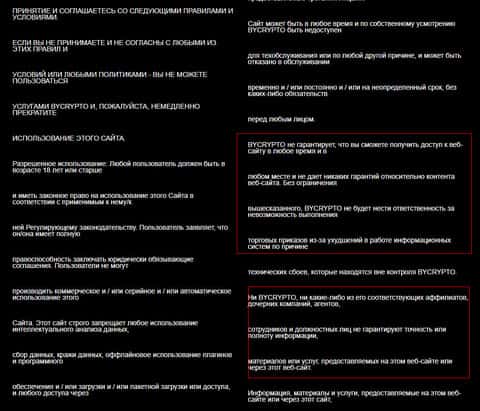 В довесок ко всему лохотрон БиКрипто, помимо предупреждений о рисках, в своих условиях заявляет о том, что жулики не несут ответственности за свою неработоспособность и за невозможность выполнения своих торговых обязательств. А так же отказываются от ответственности лохотронщики ByCrypto за любую информацию, предоставляемую ими, или аффилированными компаниями, клиентам.