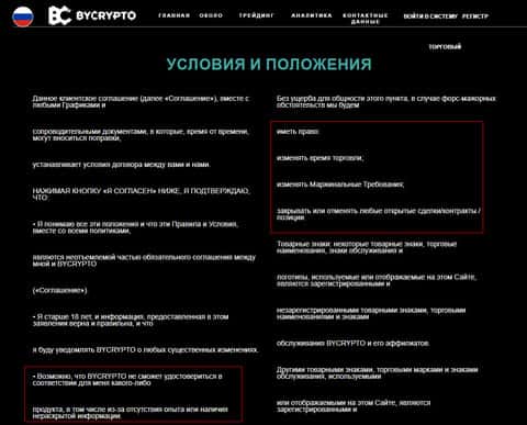 Согласно условиям мошенников ByCrypto вы их принимаете и согласны с ними фактом регистрации и использования кухни БиКрипто. О своих же обязанностях аферисты ByCrypto предпочитают тактично умолчать и спихнуть все на неизвестно какие рыночные правила и условия. На изображении ниже вы можете прочесть условие жуликов БиКрипто относительно регистрации клиентов.