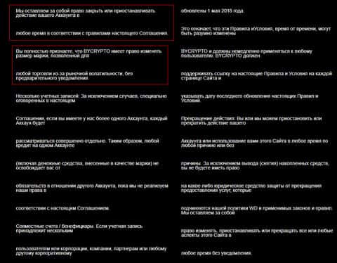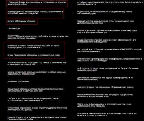 Условия и положения у мошенников БиКрипто представлены максимально криво, да и к тому же абсолютно не читабельны из-за их оформления. Но аферисты ByCrypto уже с первых секунд прочтения заявляют о том, что они имеют право изменять время торговли, изменять маржинальные требования и закрывать или открывать любые контракты, сделки, позиции. В придачу жулики БиКрипто еще и оставляют за собой право требовать от вас документы для верификации личности.
