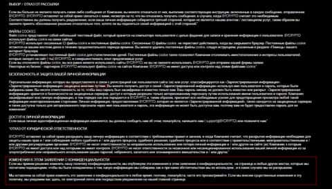 Ну а далее краткая политика конфиденциальности шулеров БиКрипто содержит в себе информацию о куки и тп, а также немного воды о том, что вашу информацию якобы защищают. Заканчивается политика конфиденциальности предупреждением лохотрона ByCrypto вас о том, что они по своему усмотрению в любой момент могут изменить данные условия.