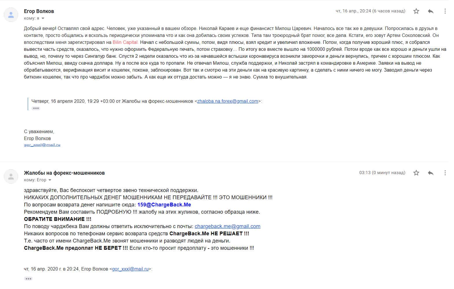 Пострадавший клиент мошеннической организации Билин Капитал еще и прислал письмо, где более подробно описан случай, произошедший с ним в данной конторе Форекс. Ниже можно ознакомиться с детальной жалобой на дилинговый центр BilinCapital.