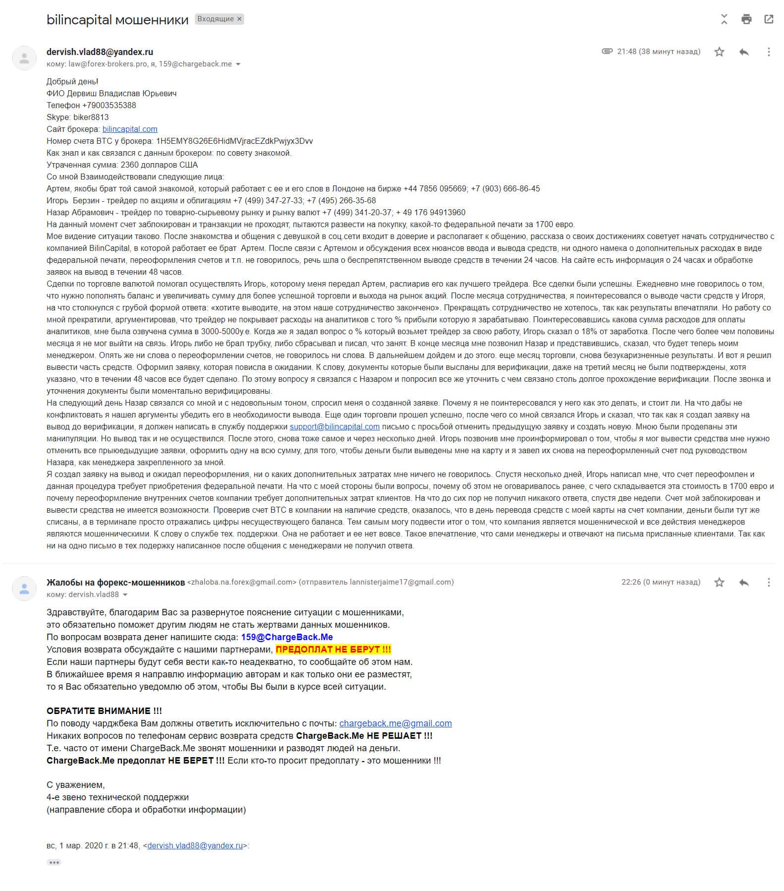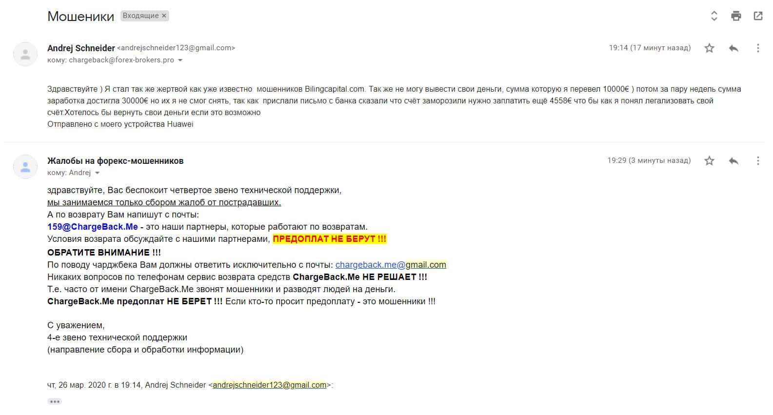 Далее представлена первоначальная жалоба, которую нам прислала жертва мошеннических действий Билин Капитал.