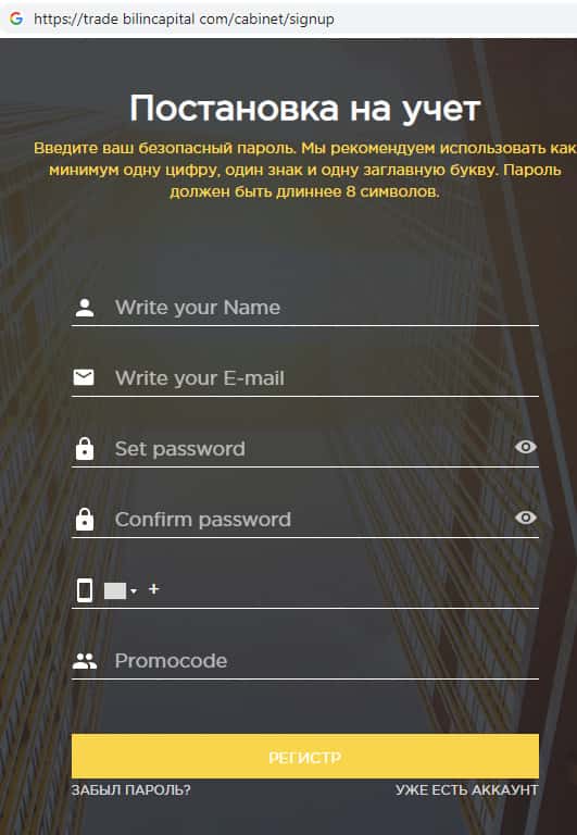 Скам-организация Билин Капитал ведет сбор данных о клиенте на своем фальшивом сайте