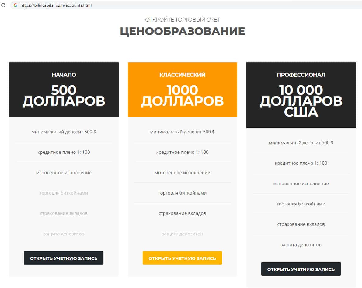 - Торговые счета, которые предлагают аферисты Билин Капитал на веб-ресурсе своей компании