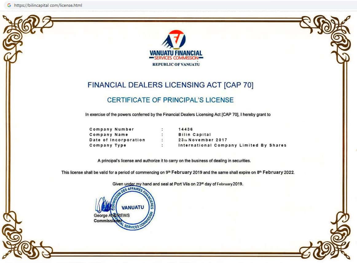 Вместо лицензии аферисты Билин Капитал предлагают пользователю взглянуть на сертификат о регистрации компании. На самом деле данная мошенническая уловка рассчитана на невнимательного пользователя. Данный документ очень легко подделать особенно если он в электронном варианте.