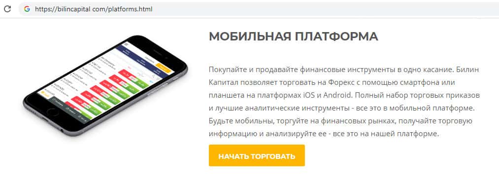 Жулики Билин Капитал предлагают пользователю скачать приложение с торговой платформой сайта на смартфон. На самом деле это делается для того, чтобы подсадить клиента на крючок. Ни в коем случае не скачивайте приложения с торговой платформой BilinCapital, потому что это лохотрон и очередной обман !!!