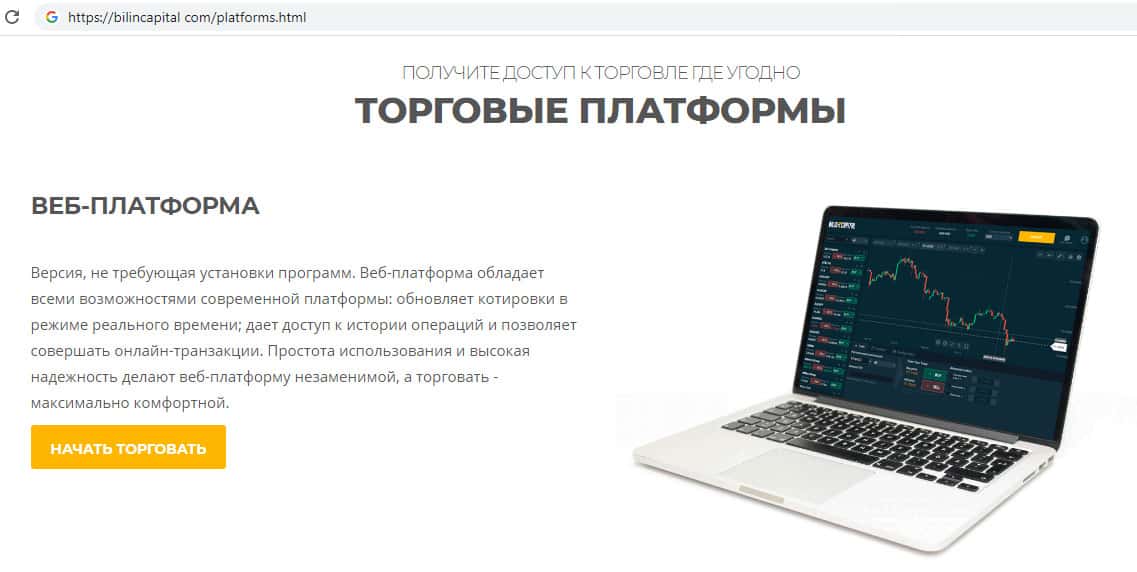 Торговая платформа на сайте мошеннической организации Билин Капитал стандартная и не практичная. Жулики данной конторы предлагают пользователю торговать на их сайте не скачивая какое-либо приложение, то есть с помощью браузера установленного на компьютере. Это шуллера BilinCapital называют удобством пользования платформой.