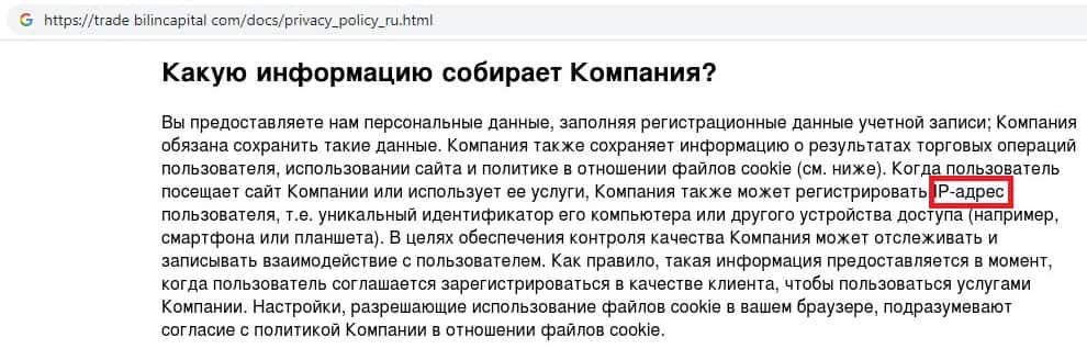 Политика конфиденциальности на сайте мошеннической организации BilinCapital