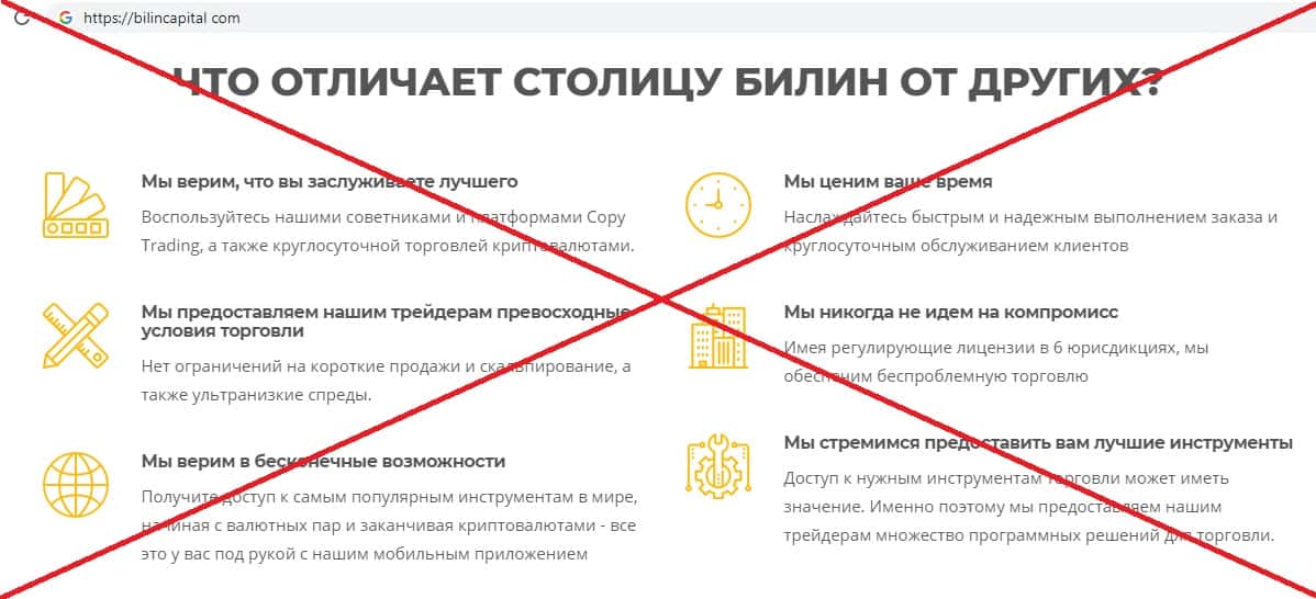 BilinCapital - очередная брокерская контора, которая обманным путем заманивает пользователей на свой фальшивый сайт, обещая доступ к торговле где угодно, а так же якобы лучшие инструменты для трейдеров. Верить обещаниям мошеннической организации Билин Капитал нельзя !!!