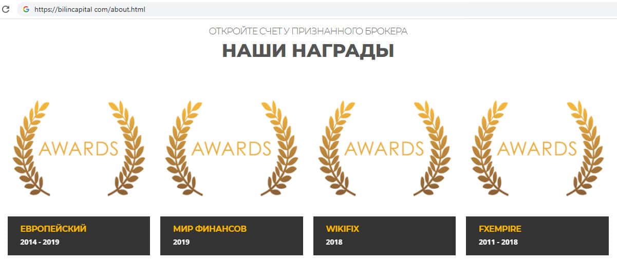 - Награды, которые якобы принадлежат брокерской конторе Билин Капитал