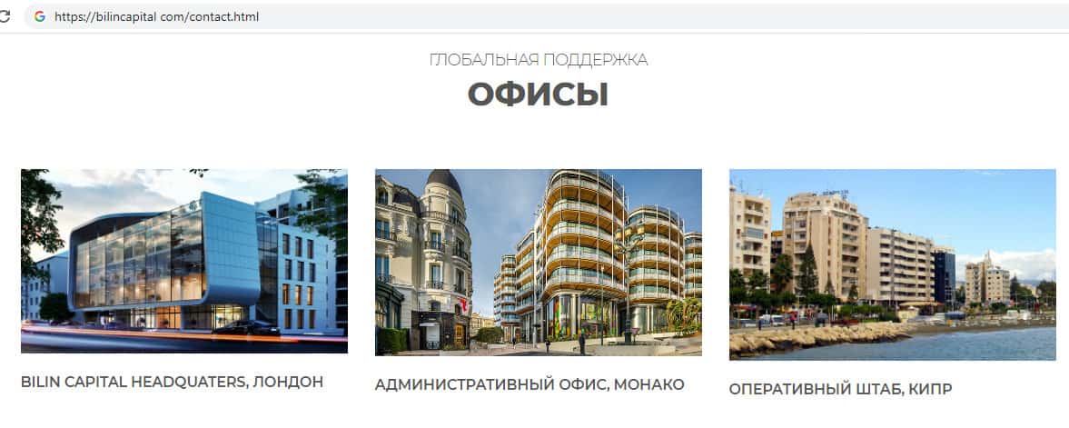 Согласно контактной информации, которую указывает о себе мошенническая организация BilinCapital, у данной брокерской имеется три офиса, один из которых находится в Лондоне, второй в Монако, а главный офис скам-организации находится на Кипре.
