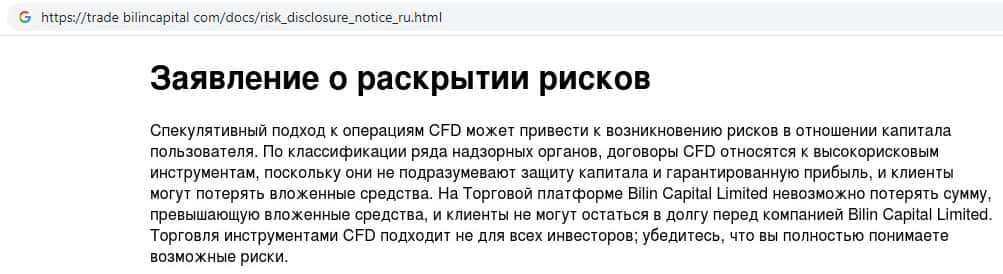 Заявление о раскрытии рисков скам-организации BilinCapital