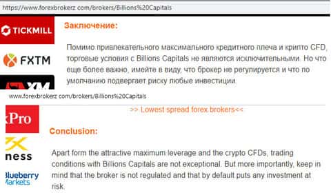 Согласно еще одной статьи, которую мы смогли найти в интернете, брокерская контора Биллион Капиталс не рекомендована форекс-трейдерам. Чтобы это доказать, они указали 5 причин, почему не стоит с ней связываться и предупреждают всех о главном: контора BillionCapitals - не регулируемый брокер.